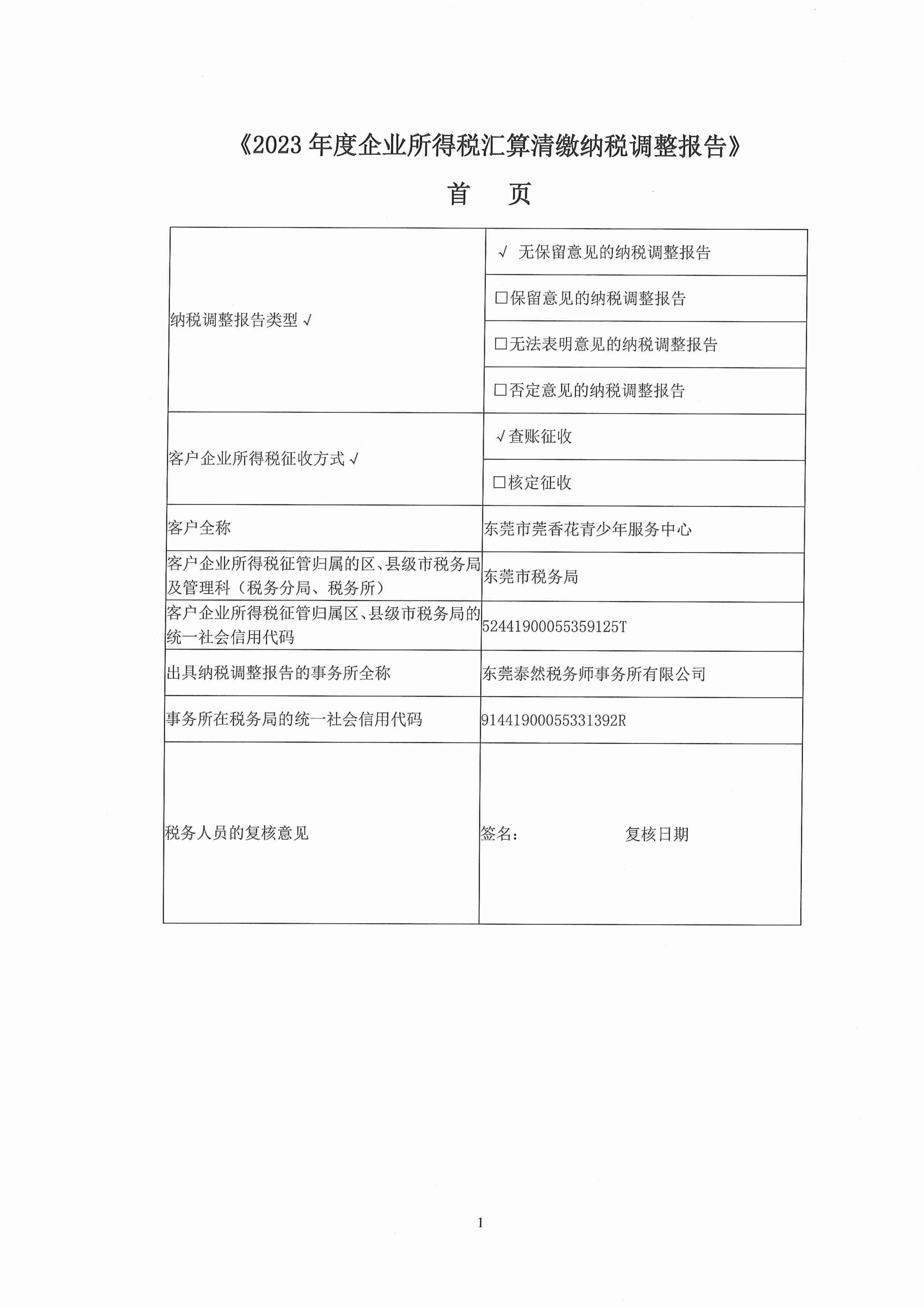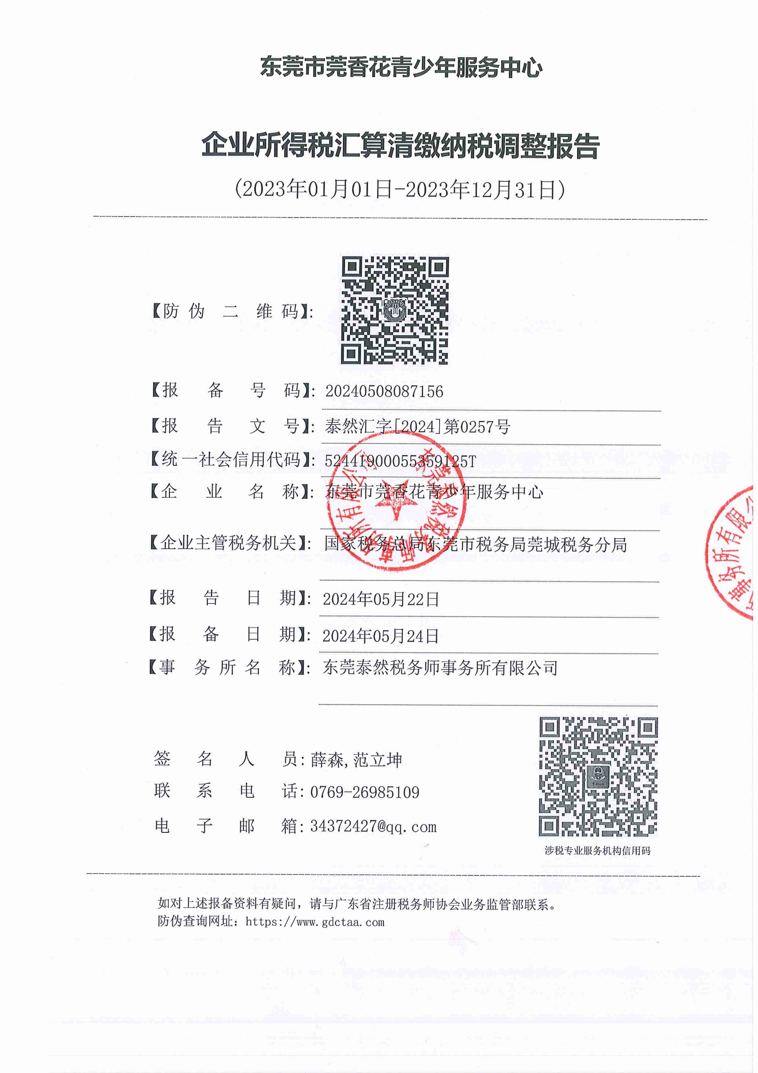 2023年东莞市莞香花青少年服务中心税审报告