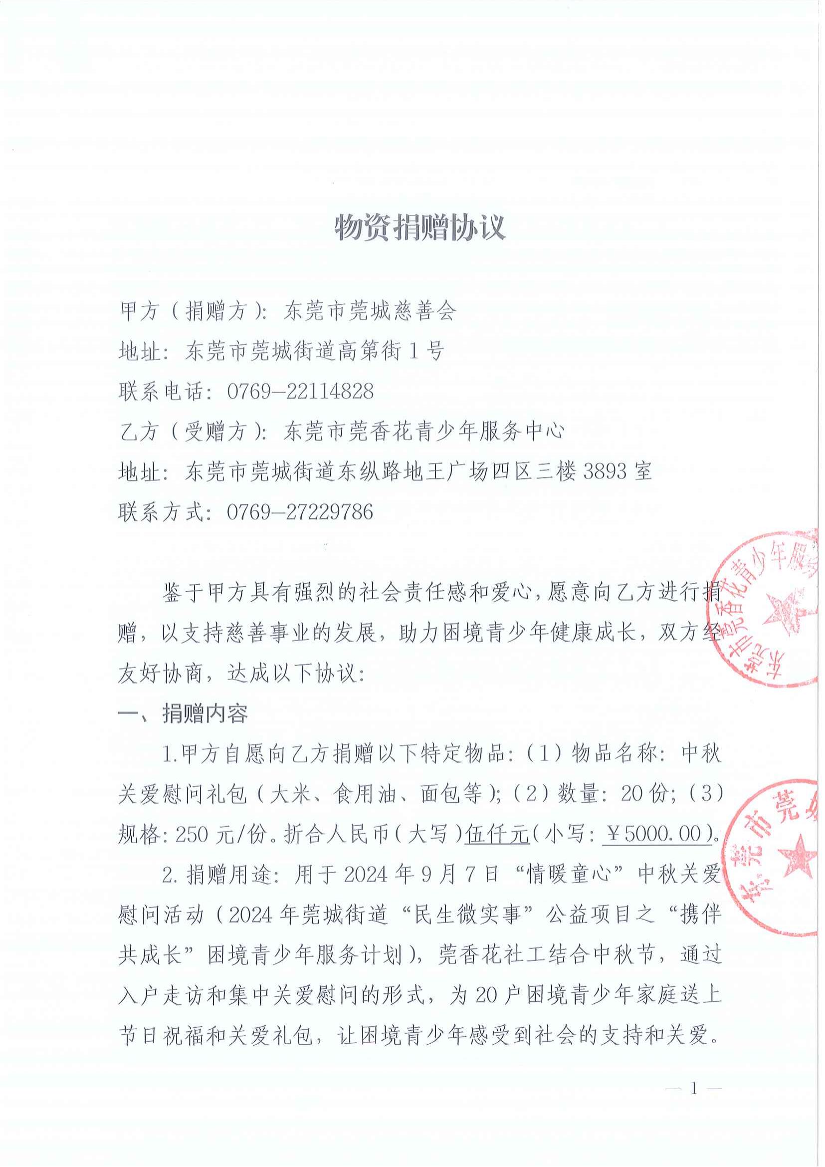 2024年9月困境青少年中秋关爱慰问活动捐赠协议