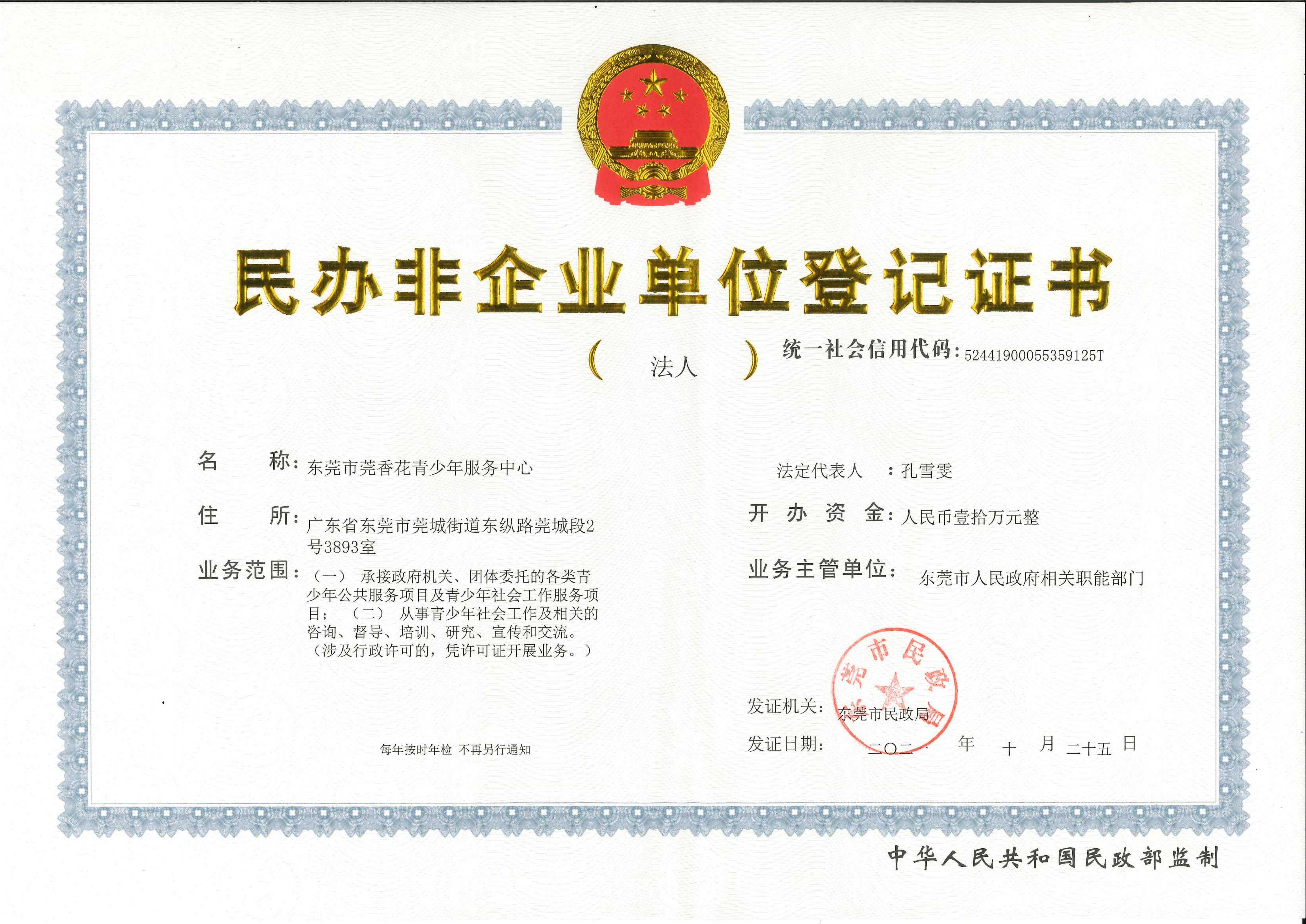 东莞市莞香花青少年服务中心登记证书(2021年核准)